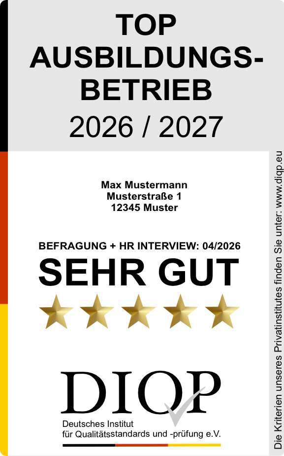 In einem zweiten Schritt werden die Arbeitgeberleistungen bewertet. Dafür findet ein HR-Interview mit der Ausbildungsleitung statt. Dabei geht es etwa um Nebenleistungen und Benefits, die Sie als Arbeitgeber den Auszubildenden bieten. Die Ergebnisse dieser beiden Befragungen gehen jeweils zur Hälfte in das Gesamtergebnis ein.Qualitätssiegel für die betriebliche Ausbildung vom DIQP Deutsches Institut für Qualitätsstandards und -prüfung e.V.